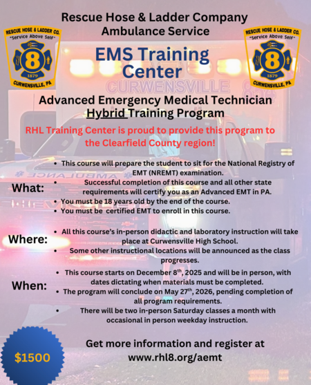 Here, you will find the currently scheduled AEMT Courses. Please click on the box to the right to be directed to the details page! Thank you for your interest in RHL's EMS Education!